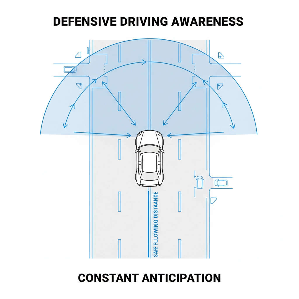 Defensive driving is about anticipating problems before they happen and always having an escape route. This mindset is crucial for teen drivers who may not yet have the experience to automatically recognize dangerous situations.